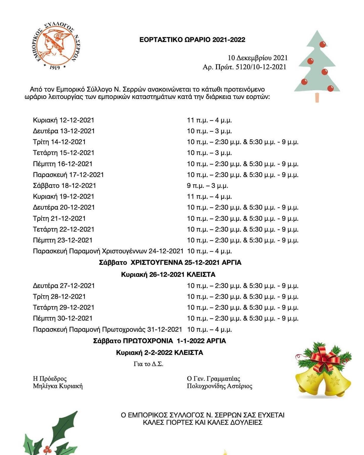 Ανακοινώθηκε και μπαίνει σε ισχύ το εορταστικό πρόγραμμα του Εμπορικού Συλλόγου Σερρών. Το ωράριο καταστημάτων τις καθημερινές θα κυμαίνεται από 10:00-14:30 το πρωί και 17:30-21:00 το απόγευμα. Η αγορά των Σερρών θα είναι ανοιχτεί την Κυριακή 19 Δεκεμβρίου από τις 11:00-16:00.