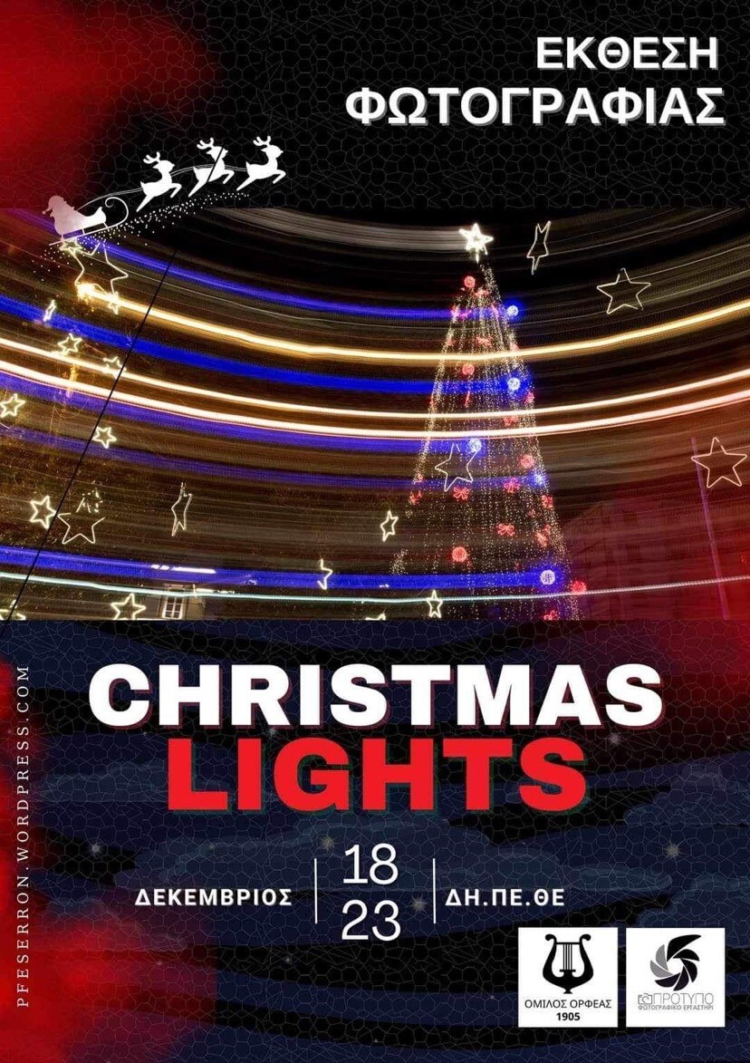 Λίγο πριν τα Χριστούγεννα, το Πρότυπο Φωτογραφικό Εργαστήρι Σερρών με την ομάδα φωτογραφίας του ΟΡΦΕΑ ΣΕΡΡΩΝ θα είναι σε εορταστικό κλίμα και διοργανώνει ένα ξεχωριστό εξαήμερο με έκθεσης φωτογραφίας των μελών του και θέμα «ΧΡΙΣΤΟΥΓΕΝΝΙΑΤΙΚΟ ΦΩΣ - CHRISTMAS LIGHTS» στο ΔΗ.ΠΕ.ΘΕ Σερρών.