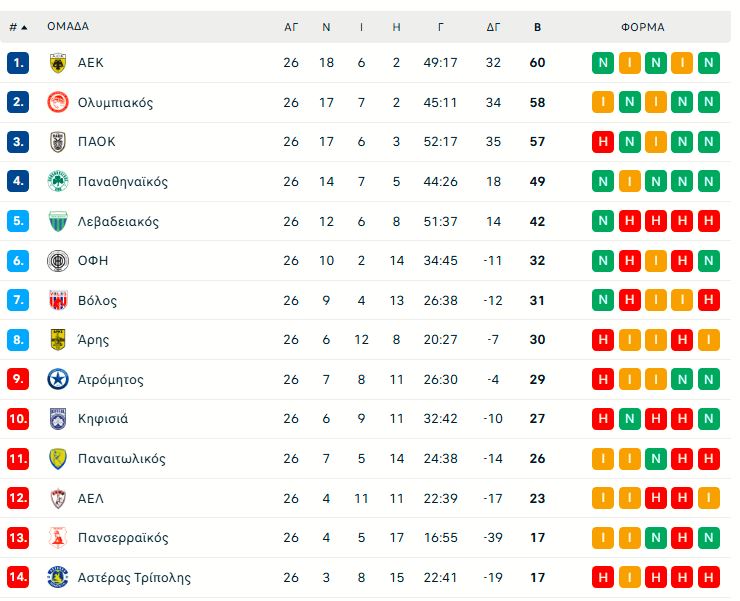 Πώς διαμορφώθηκε η βαθμολογία της Super League μετά τα παιχνίδια της 26ης αγωνιστικής, με τα οποία ολοκληρώθηκε η κανονική περίοδος – Τα playoffs 1-4 και 5-8 και τα playouts 9-14.