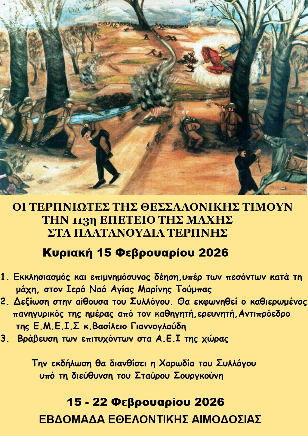 Ο Σύλλογος Τερπνιωτών Θεσσαλονίκης εν όψει των εορταστικών εκδηλώσεων για την 113η Επέτειο της μάχης στα Πλατανούδια Τερπνής (17/2/1913), προγραμμάτισε τις κάτωθι εκδηλώσεις :