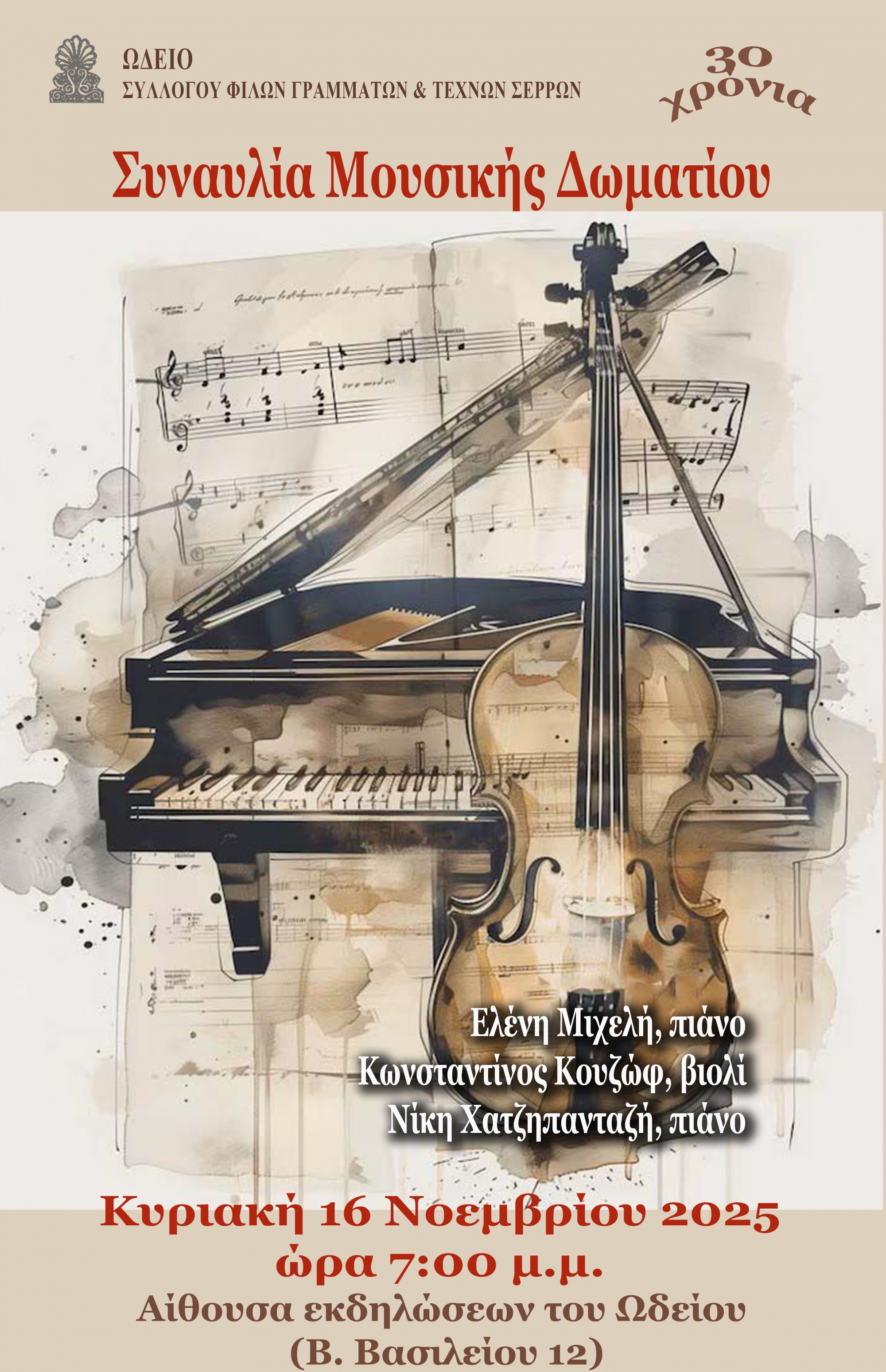 Μια όμορφη μουσική βραδιά θα χαρούν, όσοι βρεθούν την Κυριακή 16 Νοεμβρίου 2025 και ώρα 7 μ.μ. στην αίθουσα εκδηλώσεων του Ωδείου του Συλλόγου Φίλων Γραμμάτων και Τεχνών Σερρών (Βασ. Βασιλείου 12).
